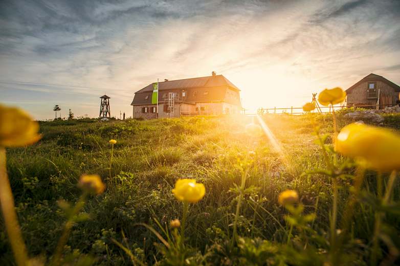 Auf etwa 1.520 Meter Seehöhe wendet sich der markierte Steig in einem leichten Linksbogen dem Hochleckenhaus zu und deutlich erkennbare Steigspuren leiten rechts den Berg höher. Diesen folgend, entdeckt man bald alte verwitterte Markierungen und wandert schließlich nach nur wenigen Metern direkt am links des Weges liegenden Eingang der Höhle beim Goldenen Gatterl vorbei. Bitte nicht in die enge Höhle klettern – Lebensgefahr! Unter der Materialseilbahn hindurch, über Wiesen und durch ein kleines Latschenfeld erreicht man schließlich nach einer Gehzeit von gut 2 Stunden den einladenden Gastgarten des Hochleckenhauses.