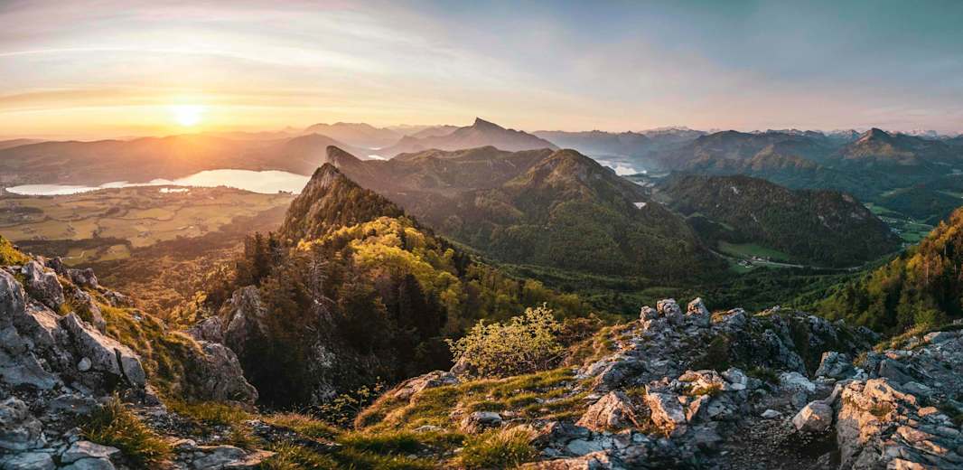 Vorbei an der kleinen und nicht bewirtschafteten Schoberhütte steigt man etwas ausgesetzt nun in gut 10 Minuten zum ebenfalls sehr aussichtsreichen Frauenkopf-Gipfel nur wenige Höhenmeter ab. Der Blick von hier auf den Fuschlsee ist einzigartig.