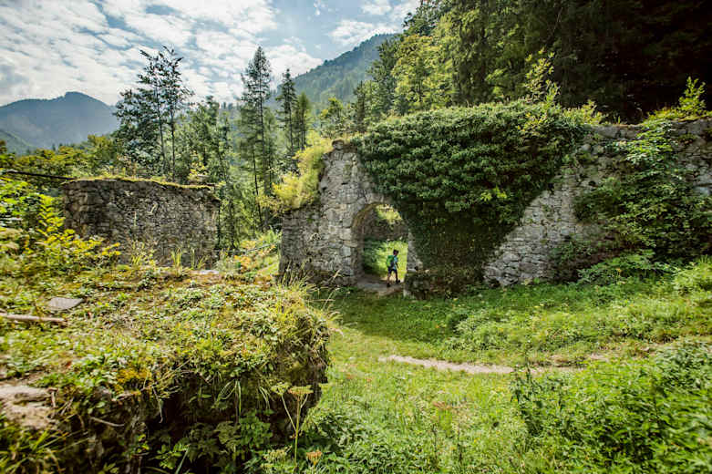 Wunderbare Ausblicke erlebt man schon hier im unteren Bereich der Ruine, und auch vom etwas höher gelegenen Mitterturm ist die Aussicht prächtig: auf Scharnstein und die gegenüberliegende felsige Bräumauer, welche wohl das Vorbild für die zweite sagenhafte Burg sein muss, oder auch hinüber nach Viechtwang und den Hacklberg. Wieder zurück im unteren, größeren Ruinenbereich, verläuft der Abstieg links hinunter, vorbei an einer teilweise vermauerten Halbhöhle, die von den Burgherren als Keller genutzt wurde, und folgt dem gemütlichen Forstweg bis in die Siedlung der Nagelschmiedstraße. An der Alm angelangt, wenden wir uns nach rechts und kommen so wieder auf bekanntem Weg zum Ausgangspunkt zurück (Rundweg Nr. 9).