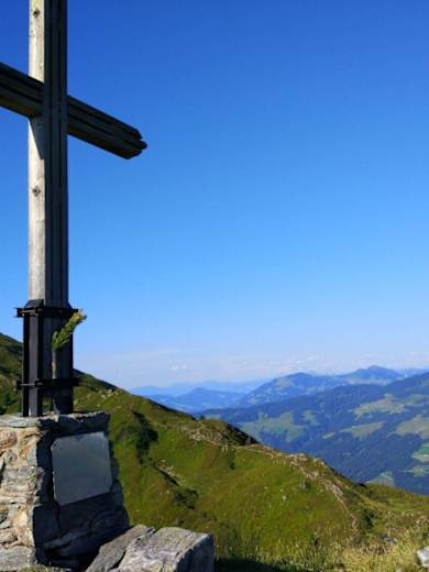 Der Blick vom Gipfel richtet sich direkt auf den Großen Beil, das weite Tal der Wildschönau und auf der anderen Seite auf die hinteren Berge der Kelchsau und die Berge der Kitzbühler Alpen.