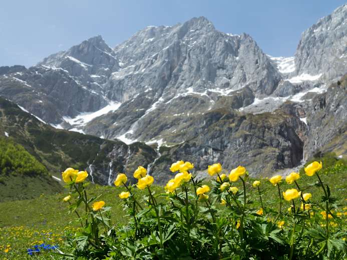 Die heutige Wegstrecke ist eine echte Genussroute, denn sie verläuft in nahezu gleichbleibender Höhe stetig entlang der Südflanke des Hochkönigs und bietet einen traumhaften Blick auf den Alpennordkamm. Start der Tagesetappe ist die Mitterfeldalm, von wo der Almenweg zuerst auf einem sonnigen Panoramaweg in rund 30 Minuten zum etwas tiefer gelegenen Arthurhaus führt. Unmittelbar oberhalb des Hotelparkplatzes geht es auf dem Mühlbacher Höhenweg in Richtung Westen.