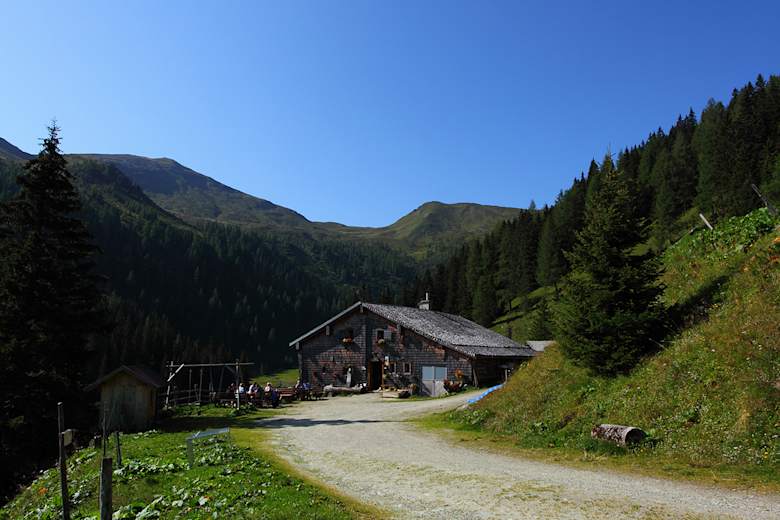 Der Almenweg führt hingegen als schöner Fußweg über die nicht-bewirtschaftete Tofernalm hinab zur Harbachalm (1.612 m) und quert dabei einige Male den Forstweg zur Tofernalm. Von der Harbachalm wählt man den Steig hinunter in den Talboden und folgt ab hier dem Güterweg. Nach einem kurzen Stück erreicht man das Einlaufbecken eines kleinen Wasserkraftwerkes und kommt an einer Kapelle vorbei. Man verlässt hier das weite Almgebiet der „Tofernalm“ (Almtor) und wechselt in einen Fichten-Hochwald. Von hier zweigt links ein idyllischer Fußweg ab, der erst durch den Wald und dann oberhalb der nicht-bewirtschafteten Grünhofalm bis nach Hüttschlag führt. Wer lieber entlang der Forststraße wandert, kann natürlich auch dieser folgen. Nach dem letzten Waldstück breitet sich ein herrlicher Blick auf das malerische Bergsteigerdorf® Hüttschlag aus. Dem Steig folgend, gelangt man schließlich direkt ins Ortszentrum, dem heutigen Etappenziel.