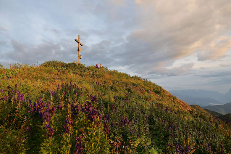 Der 2.037 Meter hohe Gipfel des Kitzsteins, auch „Gabel“ genannt, ist der nördlichste Grenzberg zwischen dem Großarltal und dem Kleinarltal: Der recht steile Anstieg führt vom Sattel über den Weg Nr. 712 erst nach Süden auf den Vorgipfel mit einem „kosmischen Kreuz“ – einem echten Kraftplatz – und weiter über den Westkamm auf den Hauptgipfel. Ist der langgezogene Rücken des Kitzsteins nach gut 3 Stunden Gehzeit erreicht, ist der anstrengendste Teil dieser Etappe geschafft.