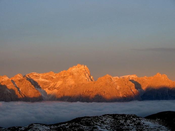 Ausblick von der Pfannspitze auf die in morgendlicher Röte erstrahlenden Dreischusterspitze in den Sextener Dolomiten. Foto: Anton Goller, Kartitsch