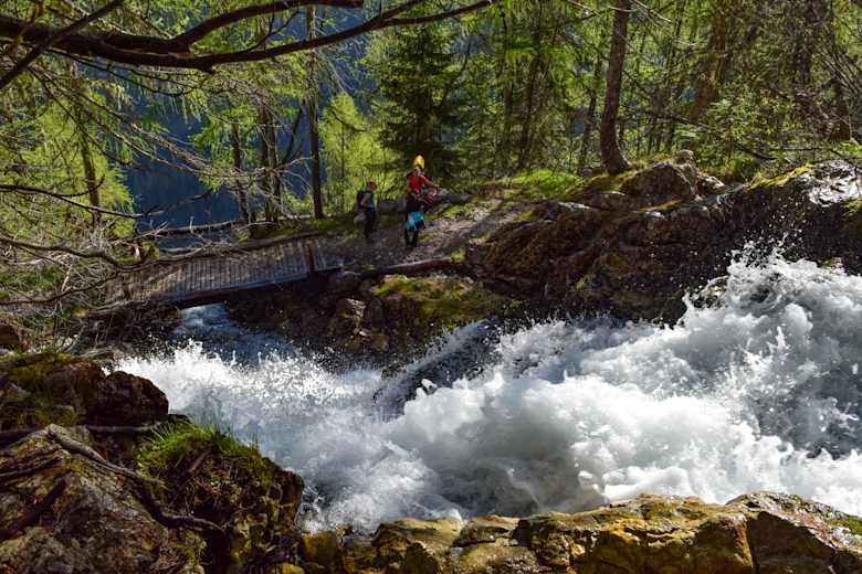 Weiter über Serpentinen, bis an den Fuß des markanten Felsens der Gatterspitze. Den Felsen entlang über den gut ausgebauten Weg, der vor dem Wasserfall steiler wird und in Stufen angelegt ist. An der Wasserfallbrücke angekommen (Vorsicht-bei Nässe und Kälte ist die Brücke oft glatt und rutschig) führt der Weg in Serpentinen wiederum mit Stufen versehen bis zur Prinz Heinrich Kapelle (Notunterstand – Hütte).
