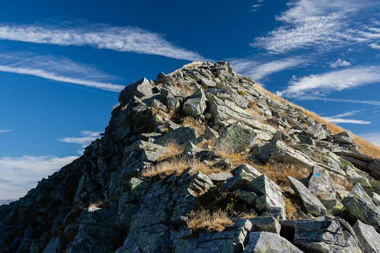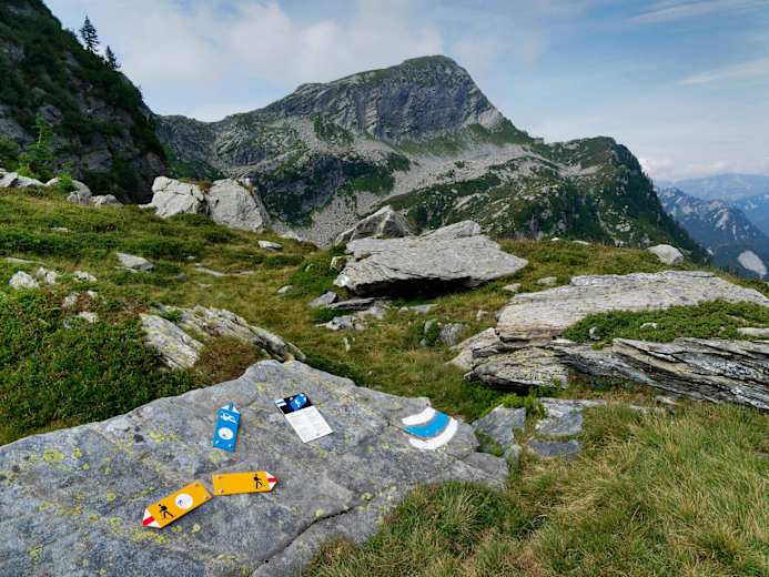 Ein Großteil des Weges verläuft über den Grat - die weiss-blauen Markierungen weisen den Weg.Foto: 2022 Via Alta Vallemaggia / Marco Volken