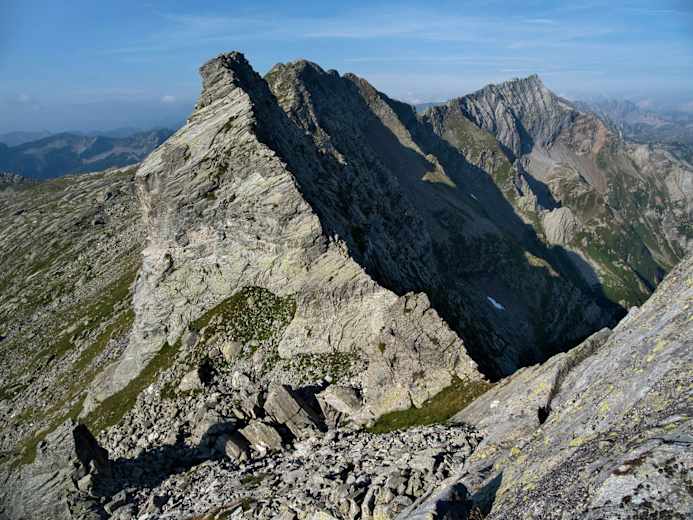Die zweite Etappe führt von der Capanna Ribia in rund 3,5 h Stunden Gehzeit bis zur Capanna Alzasca. Ein Großteil des Weges verläuft direkt über den Grat, einige Kletterstellen, die mit Ketten gesichert sind, inklusive. Der Abschnitt ist wunderbar abwechslungsreich und kurzweilig und die Aussicht sucht ihresgleichen.