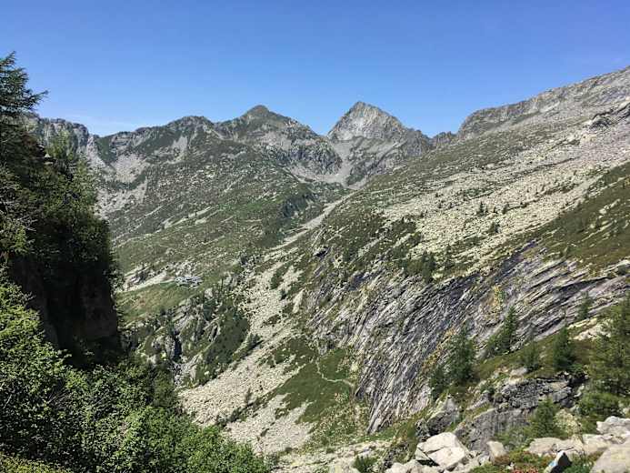 Später dreht man rechts ab bis zum Waldrand, traversiert mehrere Runsen, kommt an der Alpe Cuasca vorbei – mit dem einzigen Brunnen an der Strecke –, und peilt den Passo dei Due Laghi an. Der Übergang verbindet die Zwillingstäler Valle di Coglio und di Giumaglio, während die beiden Seen, je einer dies- und jenseits des Sattels, zur Rast einladen, vielleicht auch zu einem Fussbad oder zu ein paar Schwimmzügen.
