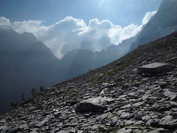 Oberhalb Tomeo weitet sich die Landschaft mit jedem Schritt, während die Sonne neben dem Monte Zucchero aufgeht. Beim Corte Piatto dreht man nach links zur Bassa di Pertüs, wo unvermittelt die Corona di Redorta auftaucht, einer der elegantesten Gipfel entlang der Via Alta.