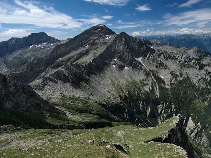 Gemäss Landeskarte sollte man sie links umgehen können, hoch oben, was auf den ersten Blick kaum möglich erscheint. Doch wie so oft entdeckt man vor Ort Spuren, Felsbänder und kleine Tricks, und die Sache entpuppt sich als gar nicht so heikel. Anschliessend führt ein Auf und Ab durch die mal grünen, mal steinigen Flanken des Madas und des Pizzo Campala. Der ausgesetzte Abstieg von der Bocchetta della Campala erfordert nochmals etwas Konzentration.