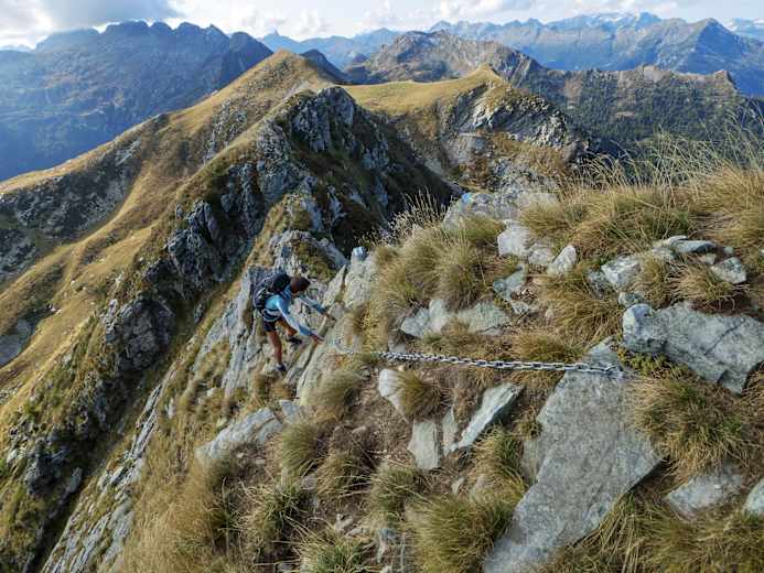 Zwischen Alzasca und Canaa zeigt sich die Topographie etwas weniger grimmig und erlaubt einen aussichtsreichen Ritt über die Krete, die ab der Bocchetta di Doia mal als breiter Rücken, mal als scharfe und luftige Schneide daherkommt. Dem Grat entlang überwindet man so, mit einem Fuss im Vallemaggia und einem im Onsernone, sämtliche Erhebungen – mit Ausnahme eines kompakten Aufschwungs, der dank einem Felsband und einigen Ketten in der rechten Flanke umgangen wird. Der elegante Grat gipfelt im markanten Pizzo Cramalina, dem höchsten Berg des Valle di Lodano. Von dort erkennt man bereits weit unten die Capanna Alpe Canaa.