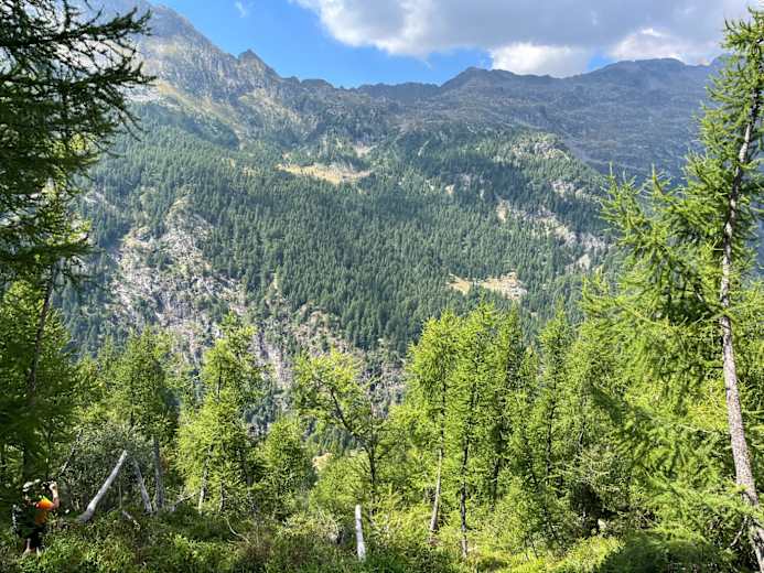 Doch nach der Bachquerung lässt man die höhere Variante und deren schroffe Umgebung rechts liegen und taucht in die Welt der Hirten ein, die jedes Felsband auf kluge Weise zu nutzen wussten, um ihre Herden von einem kargen Weideplatz zum nächsten zu führen. Alles hier ist grün, da und dort auch verbuscht. Weiter unten dann lichte Lärchenwälder und eine Cascina, die in der Landeskarte als Nuova bezeichnet wird – neu deshalb, weil die meisten Alphütten des Val di Prato noch deutlich älter sind. Sanfte Wiesen leiten zu einem Steg über den schäumenden Bach, der das Wasser des Campo-Tencia-Kessels sammelt. Viel fehlt nicht mehr bis zum Rifugio Alpe Fontana, einer spartanischen Unterkunft, die kürzlich aus einem sanften Umbau des Corte di Fondo entstand.