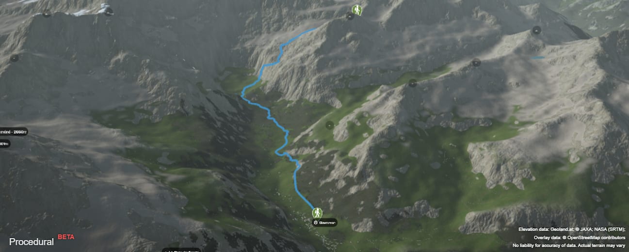Etwas hinauf und über den Bach (1.585 m), dann beginnt der eigentliche Anstieg. Um 1.800 m ist eine Steilstufe zu meistern, auf 1.905 m wird die (Echelle) Leiter überwunden und auf 1.980 m ist das gestufte Gelände geschafft.