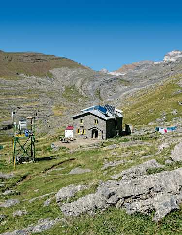 Ein guter Rastplatz (Wiesengelände) ist auf 2.070 m. Dann steigt man zu einem Aussichtspunkt (2.300 m) auf mit atemberaubendem Blick in den Zirkus von Garvanie mit der Grand Cascade. Es folgt der Schlussanstieg und nach 1.265 Hm und 4,25 h Gehzeit erreicht man die eher spartanische Sarradet-Hütte (2.587 m) aber in bester Lage.
