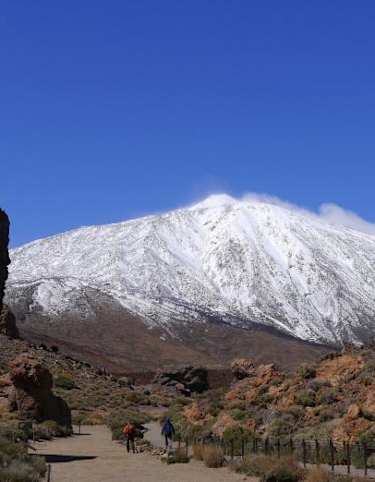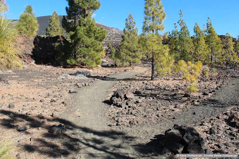 Vom Mirador folgen wir dem deutlichen Weg, der sich nach 30 m bei einer Wegtafel gabelt – hier biegen wir rechts ab auf Weg 32, der in östlicher Richtung auf den Teide zuführt. Der Sandweg verläuft etwa parallel zur Straße und führt nach 5 Minuten links an einem Regenmesser vorbei. 100 m danach ignorieren wir einen links abzweigenden Pfad. Wenige Minuten später halten wir uns an der Gabelung halb links mit Weg 13, am linken Rand eines Lavafeldes (halb rechts verabschiedet sich Weg 32 in Richtung Pico Viejo, siehe Variante).