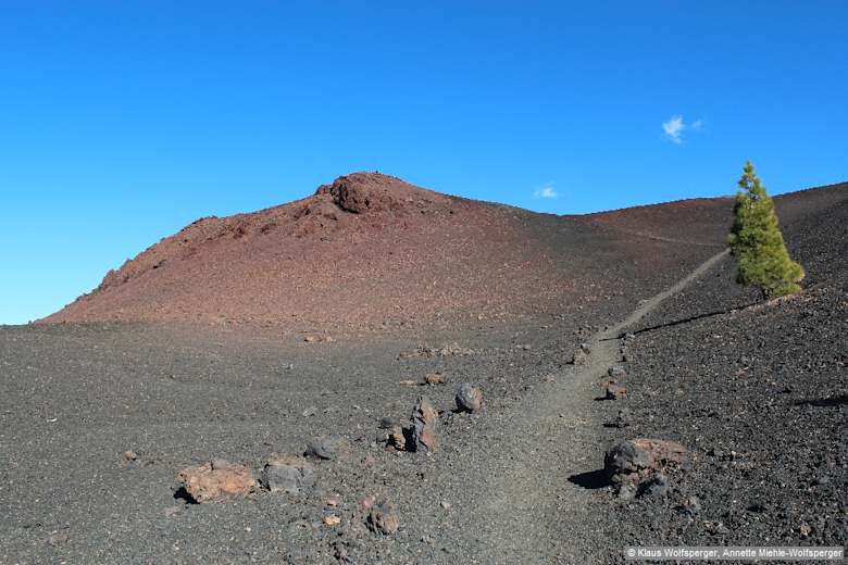 Der Weg steigt nun durch eine Rinne rechts des schwarzen Vulkankegels der Montaña de la Botija an. Hinter uns, in der Ferne, sehen wir die Insel La Gomera, links dahinter El Hierro und weiter rechts, mit dem Doppelhöcker, La Palma. Eine Viertelstunde nach der letzten Gabelung verflacht sich der Weg – vor uns baut sich jetzt der mächtige Pico Viejo auf, dahinter spitzt der Teide hervor. Der Pfad hält direkt auf diese Gipfel zu und verläuft bald wieder am linken Rand eines weiteren, lang gestreckten Lavafeldes in einem flachen Tal. Allmählich, nach insgesamt einer guten Dreiviertelstunde, gelangen wir auf die Höhe eines Lavasandrückens – links, etwas unterhalb, sehen wir eine allein stehende junge Kiefer. Hier knickt unser Wanderweg scharf links in Richtung Montaña de la Botija ab (der gerade Weg zur Montaña Reventada wurde aus Naturschutzgründen gesperrt).