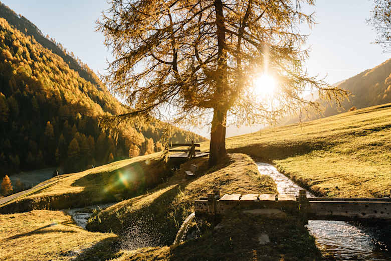 Die Bergbauernhöfe sind von steilen Wiesen und Feldern umgeben, die eine mühevolle Bearbeitung erfordern. Etwa zwei Stunden Gehzeit hinter dem Restif Hof endet der Waalweg. Der alte Höfeweg, entlang der Wanderwege Nr. 8A und 8, führt über eine Brücke, passiert die „Äußeren Glieshöfe" und erreicht in knapp einer halben Stunde den Glieshof, wo eine Einkehrmöglichkeit und Rast zur Verfügung stehen.