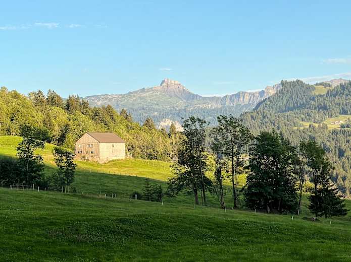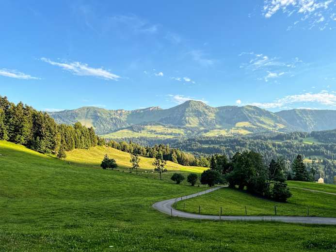 Die Hinterbergalpen liegen hinter dem imposanten Hittisberg im Bregenzerwald in Vorarlberg. Die Wanderung durch Hittisau, die alpenreichste Gemeinde Österreichs, führt durch abwechslungsreiche Waldabschnitte und entlang aussichtsreicher Güterwege. Der Blick reicht unter anderem bis zum Hohen Ifen.