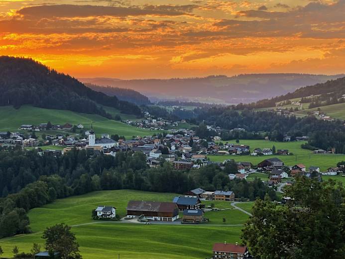 Hittisau bei Sonnenuntergang Foto: Nadine Lerho, CC BY-ND, Bregenzerwald Tourismus Bildergalerie (7)