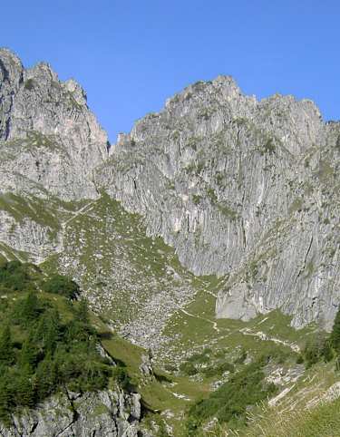 Hat man den ersten Gipfel erreicht, wird der Steig zum zweiten Gipfel, dem Steinfalk, nun etwas anspruchsvoller. Man steigt einige Höhenmeter ab und folgt dann dem Steig am Grat entlang bis zum Gipfel des Steinfalk (2.347 m).