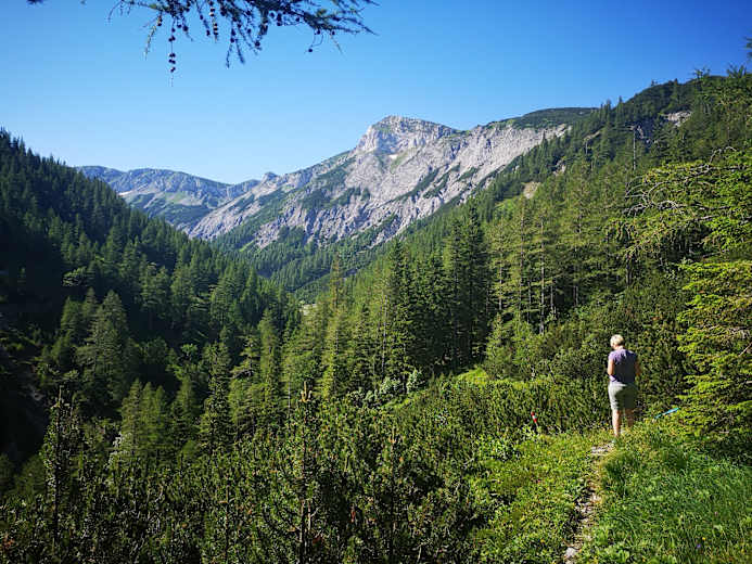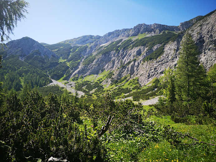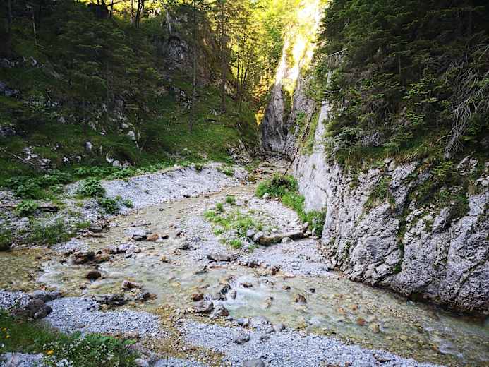Vom P beim Gasthof Leitner geht es zunächst auf einer Forststrasse ca. 3km taleinwärts (Fahrverbot!) bis zum sogenannten "Steinalpl", einem einzigartigen Naturjuwel im Naturpark Mürzer Oberland. Die weiten Schwemmkegel der Kalten Mürz ermöglichen es, dass hier einige seltene Pflanzen- und Tierarten leben (https://www.muerzeroberland.at/naturpark/naturjuwele/steinalpl/).