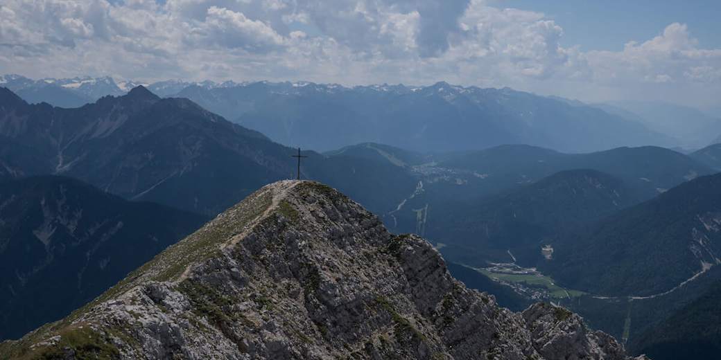 Die Besteigung der 2.180 m hohen Brunnsteinspitze (auch Brunnstein genannt) an der Grenze Österreich-Deutschland im Naturpark Karwendel ist eine einsame und anspruchsvolle Unternehmung. Der Gipfel belohnt dafür aber mit einer beeindruckenden Rundumsicht. Ausgangspunkt der Tour ist der Bahnhof in Scharnitz.