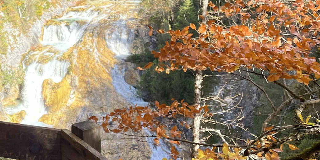 Die Wanderung auf dem Karwendelklammsteig lässt sich auch verlängern. Würden wir weiter geradeaus ins Karwendeltal gehen, könnten wir nach gut einem Kilometer rechts den Karwendelbach überqueren – dort wo dieser direkt nach einem Wasserfall beginnt sich tief in die Klamm einzugraben. Über eine Forststraße gelangen wir zum Gasthof Wiesenhof, von wo aus wir schließlich einfach die Straße entlang zurück zum Parkplatz Länd spazieren (Gehzeit: +1h).