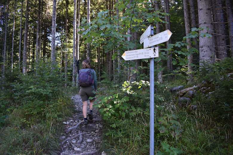 Nach einer kleinen Brücke geht der Wanderweg nach Rechts in den Wald. Danach immer der Beschilderung "Ofterschwanger Horn" folgen.