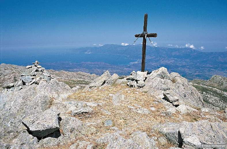 Viele Wanderer machen hier kehrt. Wir aber steigen weiter über den Rücken an, bald etwas links haltend, und erreichen nach einer halben Stunde die Bocca Tiobuli, 1238 m, auf dem Hauptkamm. Über diesen wandern wir rechts bergan. Nach wenigen Minuten kommen wir an einer kleinen Steinhütte vorbei und steigen weiter am Kamm hinauf zu einer farnüberwucherten Rinne (Achtung: Hier nicht geradeaus weiter zu einem weiteren Steinhaus in einer Felsmulde, sondern rechts auf den gelb und mit Steinmännchen markierten Pfad abzweigen!), die links neben dem felsigen Grat steil hinaufzieht zu einem kleinen Wiesenplateau auf der Rückseite eines Felssporns (½ Std.). Der Pfad wendet sich hier der rechten Kammseite zu, nun mit Blick zum Monte Astu, und verläuft immer durch den Hang bis zum flachen Sattel vor dem Gipfelaufbau (20 Min.). Von dort auf gut markiertem Weg über den felsigen Grat hinauf zum Gipfelkreuz (¼ Std.; zuletzt leichte Kraxelei, Kette). Der Rundblick ist fantastisch, er reicht von Île-Rousse über die Agriaten, St-Florent, das Cap Corse und den Monte San Petrone bis zu den Zweitausendern.