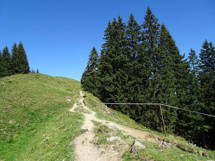 Beim Rückweg zweigen wir in der Senke vor dem Weiherkopf nach links ab und Folgen dem Weg zur Mittelstation der Hörnerbahn.