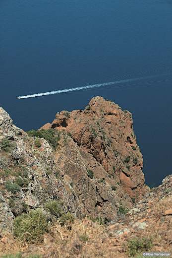 Von der Passhöhe der Bocca a Croce zweigt in westlicher Richtung eine Pistenstraße ab, die nach 800 m (10 Min.) einen Bergsattel überquert (Punkt 272 m, Parkmöglichkeit). Hier verlassen wir die Pistenstraße, die zum Bootsanleger Vignola hinabzieht, auf einem deutlichen, in westlicher Richtung abzweigenden Pfad. Er ist teilweise etwas abschüssig und führt auf der rechten Kammseite durch Buschwald an den Fuß der Punta Castellacciu heran (10 Min.). Hier wandern wir rechts haltend auf dem Pfad bergan. An der Gabelung nach 3 Minuten halten wir uns rechts. Der Pfad zieht jetzt äußerst steil, mitunter auch sehr abschüssig bergan (meist jedoch guter Halt an Bäumen und Felsen). Nach gut 10 Minuten – wir befinden uns nun bereits auf der Nordflanke der Punta Castellacciu – folgt ein kurzer Quergang hinüber zum Nordgrat. Über diesen geht es weiter sehr steil bergan, mit großartigem Blick zur Scandola-Halbinsel und nach Girolata. Nach einer knappen Viertelstunde erreichen wir den Fuß einer höheren Felswand, an der wir uns links halten und durch die breite, von Felsen eingefasste Rinne aufsteigen. Wir gelangen nun allmählich wieder auf die Ostseite des Gipfels, auf der nach 10 Minuten ein kurzer Quergang nach links folgt (gut einprägen für den Rückweg!). Während des weiteren, nun nicht mehr ganz so steilen Aufstiegs über den Ostgrat passieren wir linker Hand riesige Felsspalten, dann ist auch schon der höchste Punkt der Punta Castellacciu, 585 m, erreicht (gut 10 Min.).