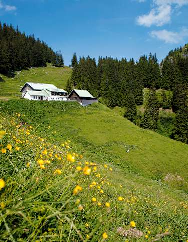 Am Immenstädter Horn folgen wir der Beschilderung zur Kesselalpe. Wir gehen den Weg weiter bergab, um kurz nach der Rabennestalpe nach links abzubiegen. Vorbei an der Alpe Gschwenderberg geht es stetig ins Tal, bis wir in Gschwend auf der Fahrstraße ankommen.