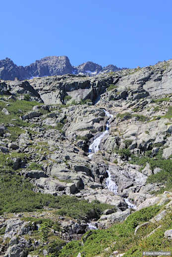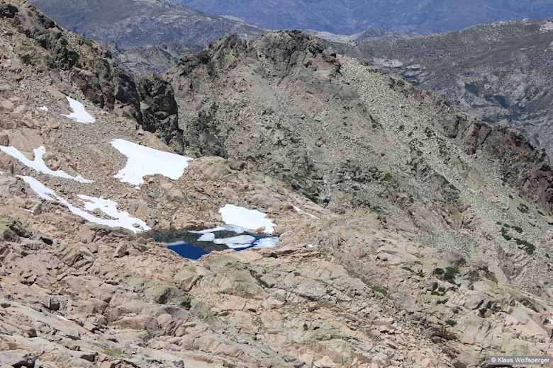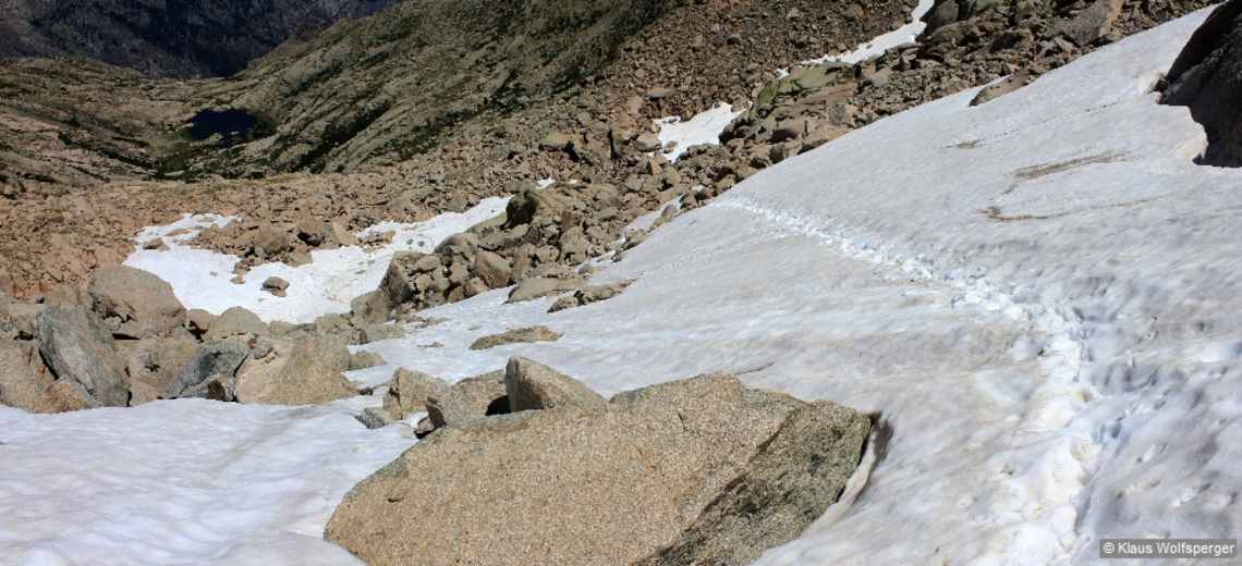 Vom See können wir bereits recht gut den weiteren Aufstiegsweg studieren. Zunächst führt uns der mit Steinmännchen markierte Pfad links haltend über Wiesen, Felsplatten und den Bach an den Rand des Oriente-Kessels. Anschließend folgt ein unangenehmer Anstieg über Felsbänder, Geröll und Felsblöcke, der in südlicher Richtung auf das deutliche, rechts des Rotondogipfels herabziehende Couloir zuführt. Am Fuß der breiten Geröllrinne überqueren bzw. umgehen wir ein häufig noch im Hochsommer bestehendes Schneefeld. Der einzige Lichtblick bei der folgenden Steigarbeit über Felsen (teils I) und Geröll ist der kleine Galierasee, der sich seitlich hinter uns auftut. Achtung: Der steile Aufstiegsweg im Couloir ist streckenweise steinschlaggefährdet! Nach 1¾ Stunden erreichen wir endlich die Scharte rechts des Gipfelblocks – direkt über dem größten Bergsee Korsikas, dem Lac de Bettaniella (Lavu Bellebone). Nun brauchen wir nur noch nach links zum nahen Gipfel des Monte Rotondo (zuletzt leichte Kletterei, I+) mit der wellblechgedeckten Biwakhütte aufsteigen.