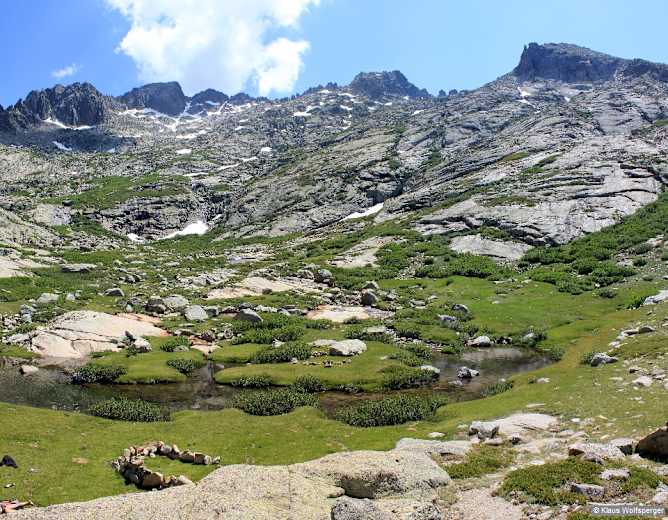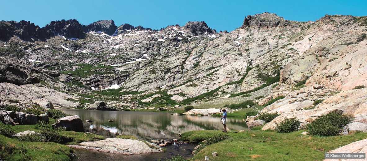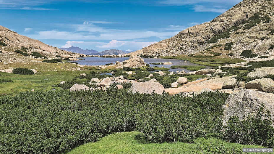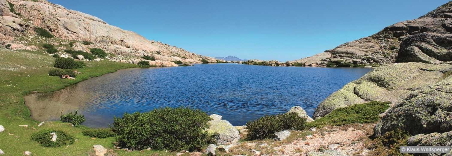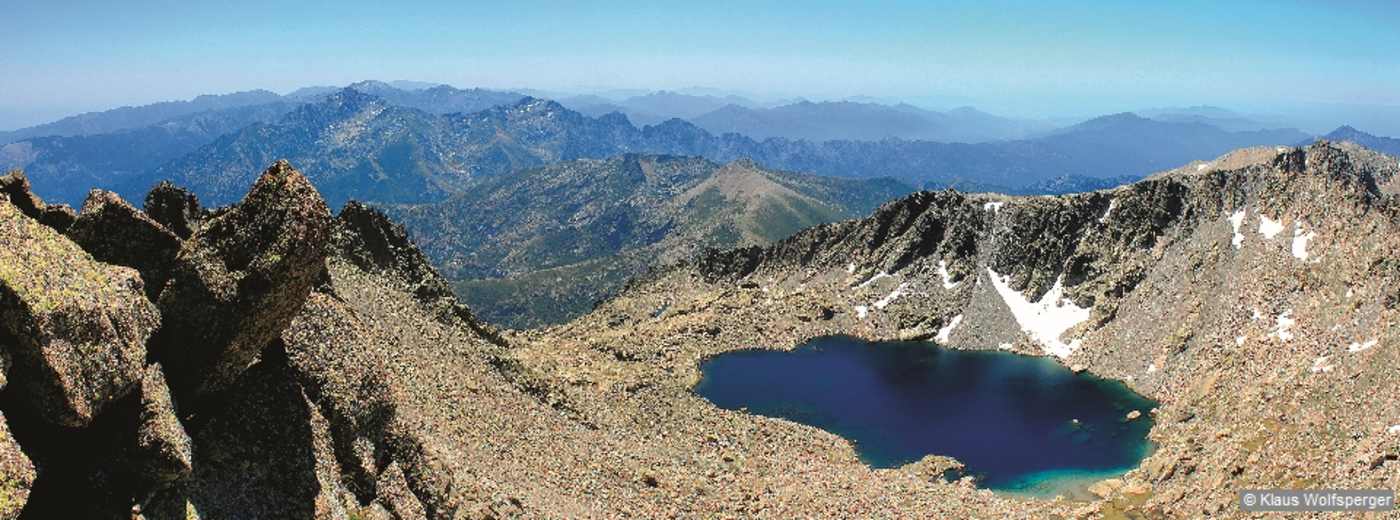 Starten Sie diese Unternehmung deshalb möglichst früh am Morgen, auch der Sicht wegen. Ferdinand Gregorovius rühmte sie in seinen Aufzeichnungen aus dem Jahr 1852: "Der Horizont, den man vom Rotondo überblickt, ist bei weitem großartiger und schöner als der des Montblanc." Tatsächlich ergibt sich bei guter Sicht ein einzigartiger Ausblick auf alle bedeutenden Gipfel und Bergseen (Ausnahme: der Melosee) der Insel. Wer keine Gipfelambitionen hat, sollte wenigstens dem idyllischen Orientesee einen Besuch abstatten. Hier oben öffnet sich eine fantastische Hochgebirgswelt, die ihresgleichen sucht: sattgrüne Wiesenmatten, plätschernde Bachläufe, blinkende Schneefelder. Es ist, als befänden wir uns in einem gigantischen Amphitheater, dessen Scheitelpunkt der Gipfelblock des Rotondo ist.