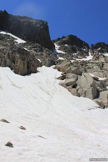 Der steile Aufstiegsweg im Couloir ist streckenweise steinschlaggefährdet. Foto: Klaus Wolfsperger