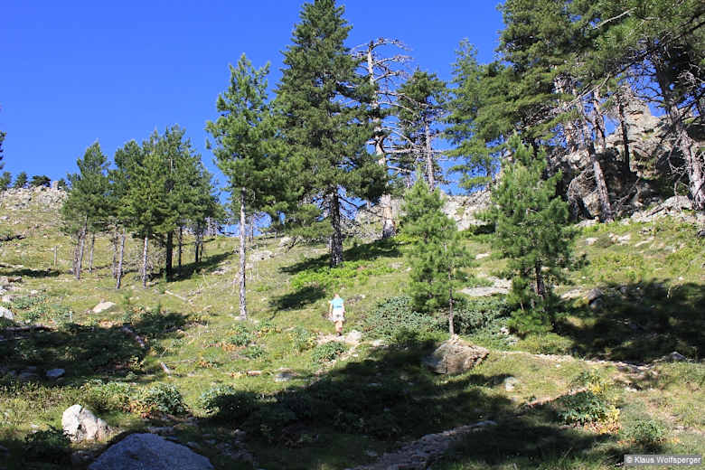 Wir gehen von der Timozzu-Brücke noch ein kleines Stück die Straße hinauf, bis links ein abgeschrankter, steiler Forstweg abzweigt (Felsblock mit Aufschrift »Timozzu/Rotondu«). Nach einer knappen Viertelstunde teilt sich der Forstweg, hier rechts weiter. Nach weiteren gut 10 Minuten geht der schattige Forstweg in einen mit Steinmännchen markierten Pfad über, der in steilen Kehren rechts des Baches durch den lichter werdenden, wunderschönen Wald bergauf führt. Nach 1¼ Stunden erreichen wir eine Gabelung (links zur Bergerie de Timozzu, im Juli/August Käseverkauf). Es folgt ein mühsamer Anstieg über einen mit Erlengestrüpp und Zwergwacholder bewachsenen Höhenrücken, später geht es etwas gemütlicher am rechten Ufer des munteren Timozzu-Baches entlang. Kurz vor einem kleinen Wasserfall überqueren wir den Bach (20 Min.). Der Pfad führt nun links haltend hinauf zu einem Sattel (10 Min.) und rechts durch den Hang wieder zurück zum Bach. Gut 10 Minuten später wechselt er abermals auf die andere Uferseite und führt uns schließlich über üppig grüne Wiesenmatten zum Orientesee mit seinen bezaubernden Gras- und Felsinseln.