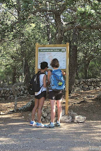 Vor der Infohütte, 490 m, des Schutzgebiets Muntanya del Voltor weist ein Wanderschild nach rechts in Richtung Camí des Arxiduc / Deià / Camí de ses Basses. Für diesen Weg bedarf es keiner Erlaubnis. Ein anfangs breiter Karrenweg zieht in teils engen Kehren weiter den Wald hinauf. Gut 10 Min. nach der Infohütte ergibt sich ein schöner Rückblick auf Valldemossa. Einige Minuten später bleibt ein links abgehender Pfad unbeachtet.