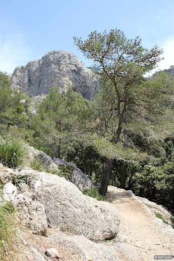 Weit vor uns türmen sich mit dem Puig Major (Radarkuppel) und dem Puig de Massanella die höchsten Gipfel der Tramuntana auf. Relativ bescheiden kommt dagegen der Puig Gros daher, der sich mit seinen 938 m nur unwesentlich über die Hochebene erhebt, doch einen tollen Tiefblick auf die Dächer und die Bucht von Deià erlaubt.