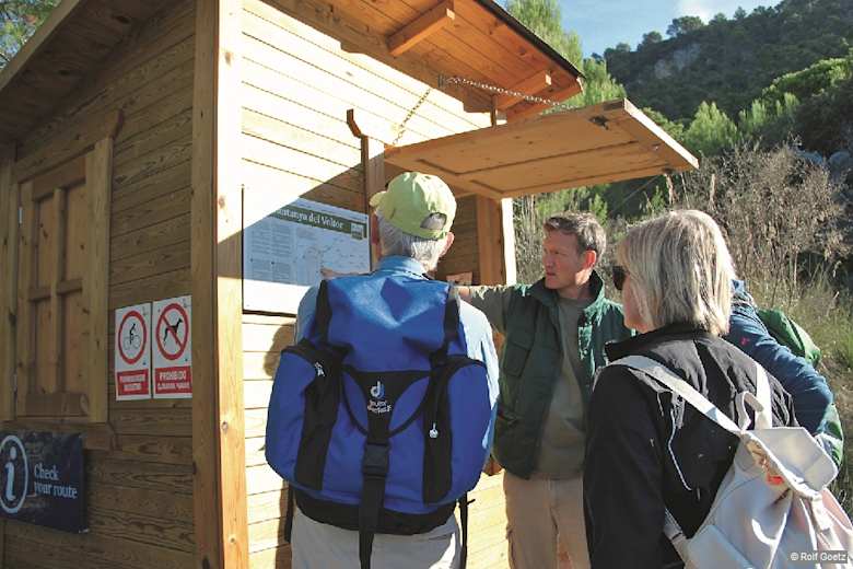 Eine Tafel informiert über das private Schutzgebiet »Muntanya del Voltor«. Foto: Rolf Goetz
