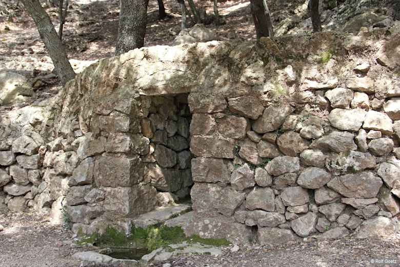 Vom Puig Gros geht es im Zickzack wieder abwärts. An einer weiteren Steinpyramide zweigt links ein Pfad zum Puig des Teix, 1064 m, ab. (Der Weg zu dem Tausender-Gipfel führt über Privatbesitz und ist derzeit gesperrt.) Weiter auf dem Reitweg nimmt uns bald wieder ein Steineichenwald auf. Der Weg senkt sich schließlich zum Refugi de Son Moragues, 774 m, ab. An der (geschlossenen) Schutzhütte beginnt ein breiter, steiler Fahrweg, der uns durch das Cairats-Tal hinunter nach Valldemossa bringen wird. Gut 5 Min. unterhalb der Hütte bietet sich der Picknickplatz Font des Polls, 697 m, für eine Rast an.