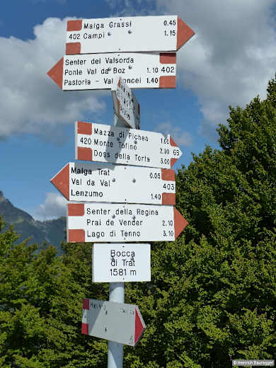 1. Der Einstieg in diese Tour ist auch beim Wanderparkplatz, 1450 m, unterhalb der Malga Trat, 1502 m, möglich. Anfahrt über den Ledrosee in das Valle dei Concei; die geteerte Zufahrtstraße beginnt am westlichen Ortsende von Lenzumo. Anstieg auf dem Hüttenversorgungsweg oder parallel dazu auf einem Pfad durch Wiesen und lichten Wald (30 Min. zum Rif. Pernici).