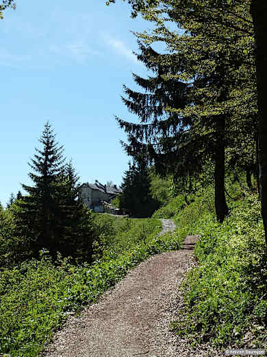 Anschließend nehmen wir den links (also Richtung Norden) abwärts führenden Fahrweg, der uns vorbei an der Baitone di Gelòs zuerst etwas steiler, dann sanft ausklingend hinunterbringt zur Malga Grassi. Dort gehen wir auf der Fahrstraße links hinüber zu dem am Waldrand gelegenen Rifugio Capanna Grassi, das uns zum Abschluss der Tour noch einmal Einkehr bietet. Von der Hütte dann links weiter und in wenigen Minuten auf der breiten Fahrstraße zurück zum Parkplatz bei der Malga Pranzo.