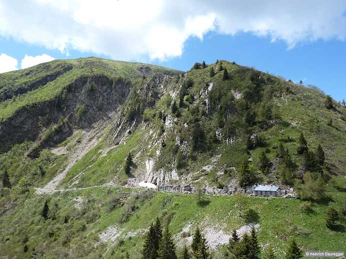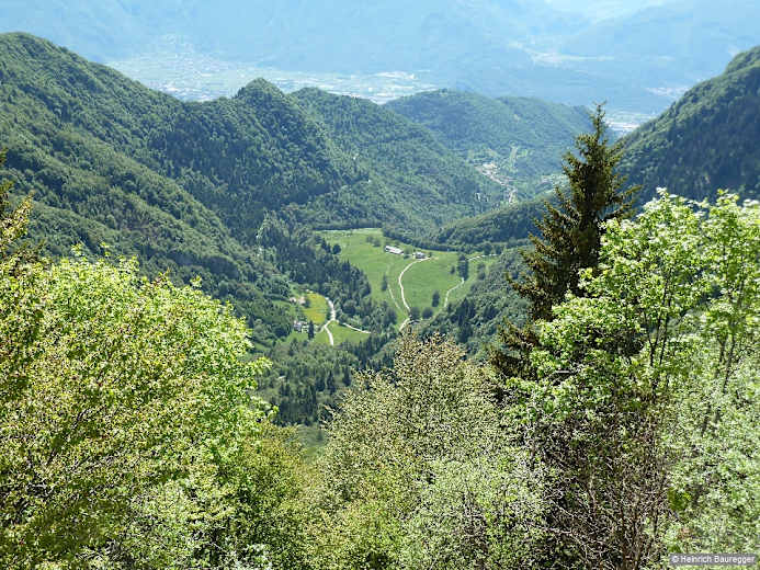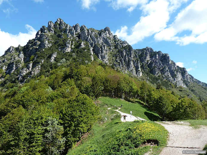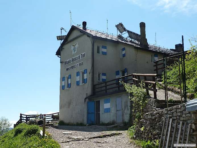 Vom Parkplatz bei der Malga Pranzo gehen wir in westlicher Richtung (also geradeaus), bis bald der Weg rechts (Mark.-Nr. 402, rot) in Richtung Rifugio Pernici weist (dabei lassen wir die Cap. Grassi links liegen). Es geht zunächst vorbei an der Malga Pranzo, dann hinein in den Wald und auf breitem Weg in gemächlicher Steigung höher. Jenseits der unbewirtschafteten Malga Dosso Fiori, 1357 m, gelangen wir über einige große Kehren hinauf zur Bocca di Trat, 1581 m. Hier stoßen wir auch auf den »Sentiero della Pace«, der über die langen Grate und Kämme verläuft und dem wir nun ein Stück des Weges folgen. Rechts davon erheben sich die steilen und zerklüfteten Felswände der Ausläufer des Corno di Pichea; und westlich des Valle dei Concei zeigt sich der höchste Berg der Gardaseeberge, der Monte Cadria. Wir gehen nun links weiter auf einem breiten Weg und treffen nach knapp 5 Min. Gehzeit auf das stattliche Rifugio Nino Pernici, das sich in aussichtsreicher Lage über den Tälern befindet. Von der Hütte führt nun ein zum Teil schmaler Höhenweg, ohne nennenswerte Steigung, durch die steilen Grasflanken des Dosso di Seavi in südwestlicher Richtung hinüber zur Bocca di Saval. Einige Kavernen aus Kriegszeiten bieten kurz hinter dem Rifugio bei Bedarf Schutz vor Regen. An der Bocca di Saval (ebenfalls einige alte, z. T. verfallende Unterstände sowie die Überreste des österreichischen Militärhospitals) verzweigen sich die Wege. (Hier Abstecher zur Cima Pari möglich; siehe Variante 2.)