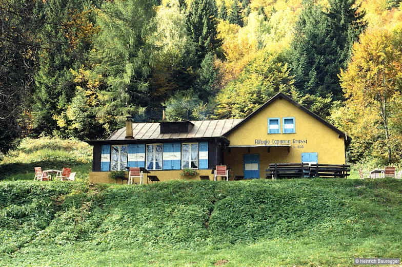 An der Malga Grassi gehen wir auf der Fahrstraße links hinüber zu dem am Waldrand gelegenen Rif. Capanna Grassi, das uns zum Abschluss der Tour noch einmal Einkehr bietet. Von hier gelangen wir in wenigen Minuten zurück zu unserem Ausgangspunkt Foto: Heinrich Bauregger