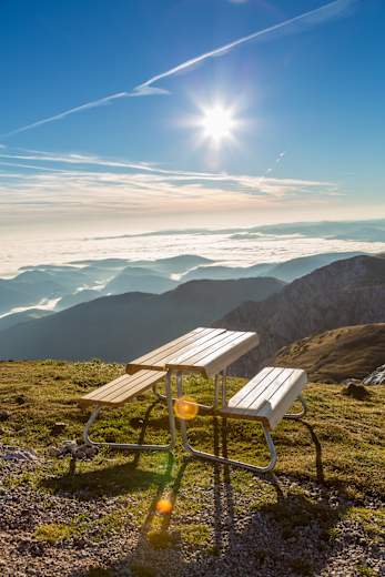 Von der Fischerhütte geht es nun auf den höchsten Punkt des Schneeberg Massives, den Hochschneeberg (2.076 m). Vom Gipfel bergab zur Kienthaler Hütte und durch die Weichtalklamm bis zum Weichtalhaus (564 m).