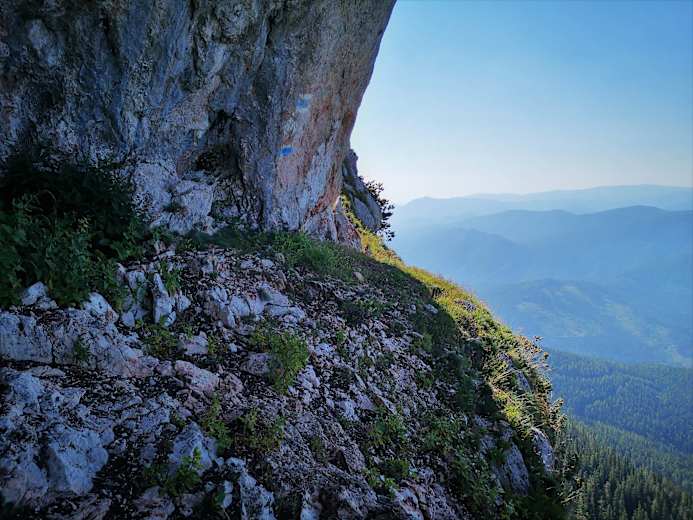 Nun direkt über etwas rasigen Fels aufwärts (Vorsicht bei Nässe!) und etwas rechtshaltend (alte blaue Markierungen) über schuttige Bänder (SG I) in einen leichten Graben. Durch diesen aufwärts (nicht nach links ausqueren, weiter oben wird der gratartige Felsvorsprung ungangbar) und immer den blauen Farbmarkierungen folgend bis zu einem felsigen Aufschwung. Über diesen hinweg (SG I - II) und ab hier etwas linkshaltend bis zur Hochfläche.