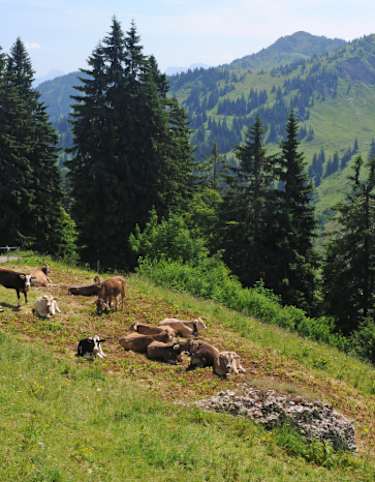 Hier lohnt sich ein Abstecher ins wildromantische Naturmoorbad. Über das aussichtsreiche Renkknie führt die Wanderung zur Hochriesalpe und – durch einen sehenswerten Bergwald – weiter zur Neuburgalpe. Danach geht es über mehrere Moorwiesen und Hochstaudenfluren mitten hinein ins Rutschgebiet unterhalb des Feuerstätterkopfes. Hier ist beim Abstieg zur Lustenauer Riesalpe etwas Trittsicherheit gefragt.