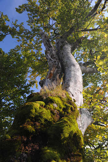 Nun kehren Sie um und die Route verläuft an der Schilpere-Alpe vorbei zum Berggasthof Obersteigalpe. Hier geht es einen kurzen Abstecher nach links in den Bergahorngarten. Jetzt führt der Weg zurück, vorbei am Berggasthof mit seiner tapferen Buche und weiter zur Unteren Stieg-Alpe. Auf diesem Weg begegnen Sie einer mächtigen Weißtanne, die 3. größte Deutschlands, einer stämmigen Fichte und einer Uralten Bergulme. Leider sind die wundervollen Laubbäume in Europa durch eine Pilzkrankheit mittlerweile vom Aussterben bedroht.