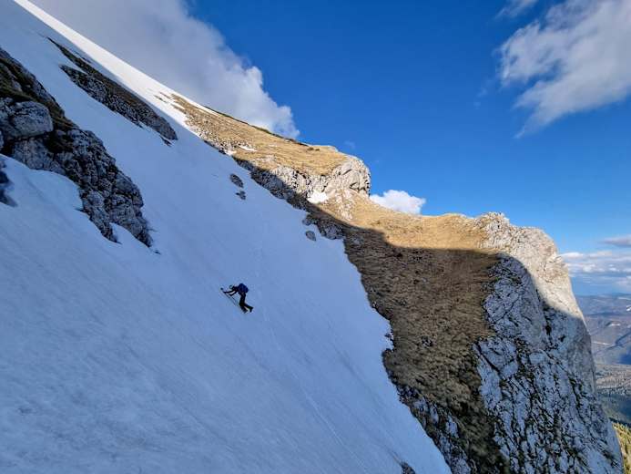Die Rinne gerade hinauf bis zur Hochfläche und weiter zur Heukuppe (bei Nebel Orientierung auf der Hochfläche schwierig!).