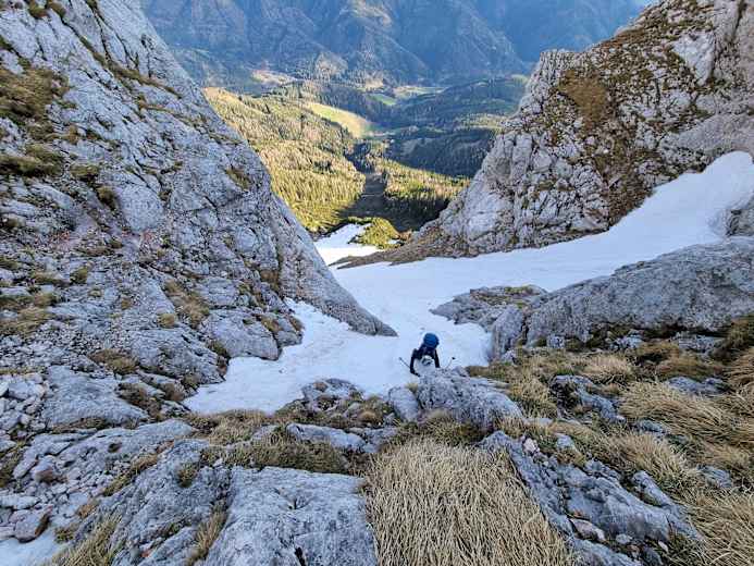 Vom Einstieg des hier beginnenden versicherten oberen Reißtalersteiges links den Wandfuß entlang bis zum Beginn des markanten Sepplgrabens (5 Minuten vom Beginn des Reißtalersteiges, Rinne, bis Mai oft schneegefüllt, dann Steigiesen und Pickel empfehlenswert).
